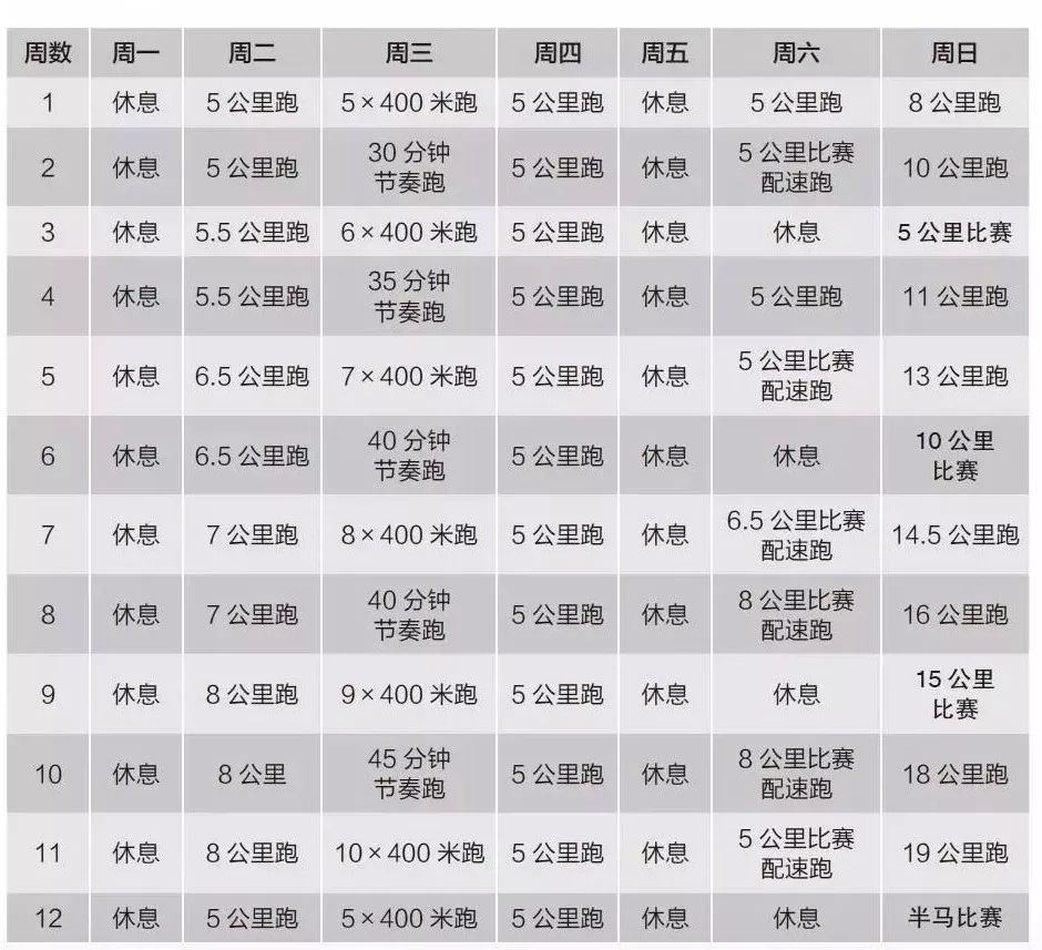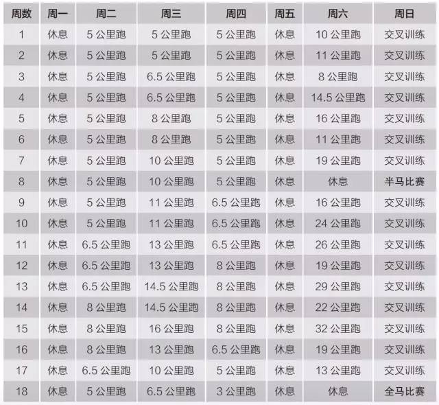 这是最流行的训练计划,其关键部分在于周六的长距离跑。从第一周是10公里跑,逐渐发展到第15周的32公里,随后开始为准备全马比赛而减量。