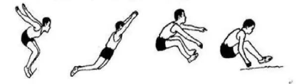 跳时双足分开与肩同宽,膝微屈,身体前倾,然后两臂自然前后预摆两次,两腿随着屈伸,当两臂从后向前上方做有力摆动时,两脚用前脚掌迅速蹬地,膝关节充分蹬直同时展髋向前跳起,身体尽量前送,身体在空间成一斜线,过最高点后屈膝、收腹、小腿前伸,两臂自上向下向后摆,落地时脚跟先着地,落地后屈膝缓冲,上体前倾。