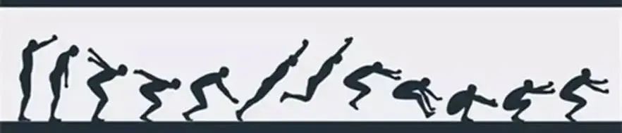 然后两腿迅速蹬伸,使髋、膝、踝三个关节充分伸直,同时两臂迅速有力向前上摆;