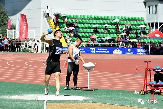 3、在投掷区5~8米的地方,设置一个平行于投掷圈延长线,高2.5米左右的橡皮筋,练习者用完整的技术将球推过橡皮筋,要求推球时展体增加出手角度。