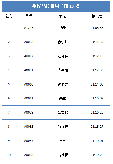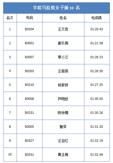 成绩录取说明:赛会半程马拉松男、女前三名按枪声成绩录取,四至八名按净计时成绩录取。