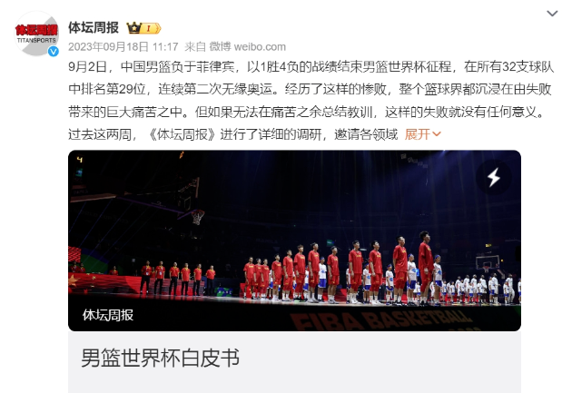 例如,2023年9月,中国男篮以1胜4负的战绩结束男篮世界杯征程,连续第二届无缘奥运会,引发舆论热议。《体坛周报》随即推出深度调查报道《男篮世界杯白皮书》,邀请各领域专家为男篮把脉,并给出十条谏言。